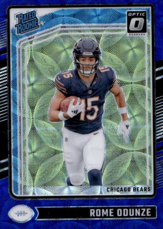 This card is 1 of 115 Rome Odunze's card variations in the 2024 Optic set being tracked by Sports Card Investor, including Base, Blue Hyper, Green Hyper, Green Velocity, and Holo.