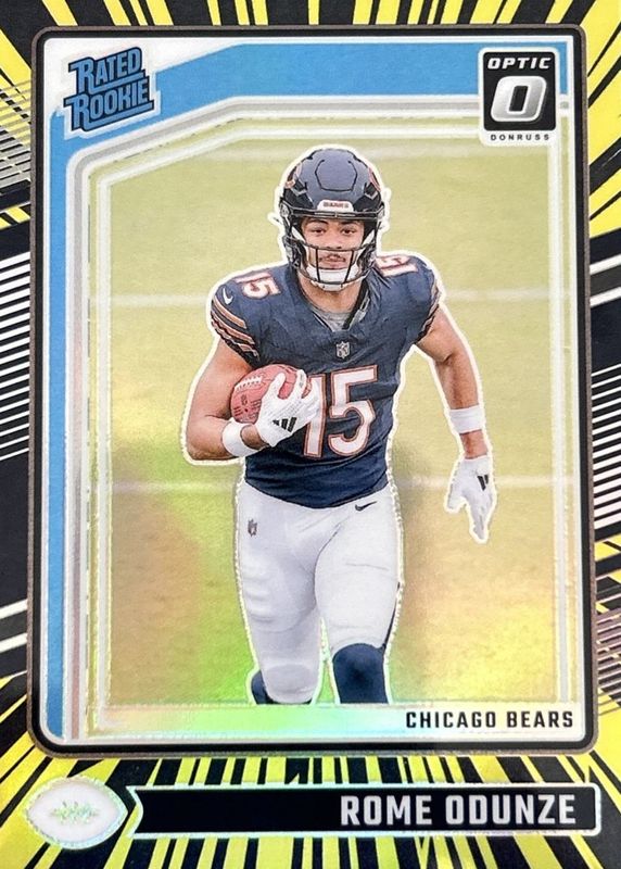 This card is 1 of 115 Rome Odunze's card variations in the 2024 Optic set being tracked by Sports Card Investor, including Base, Blue Hyper, Blue Scope, Green Hyper, and Green Velocity.