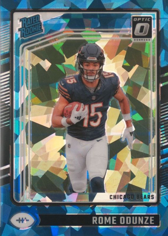 This card is 1 of 115 Rome Odunze's card variations in the 2024 Optic set being tracked by Sports Card Investor, including Base, Blue Hyper, Blue Scope, Green Hyper, and Green Velocity.