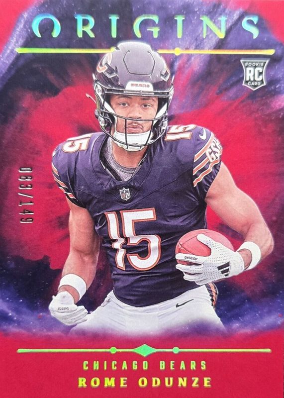 This card is 1 of 27 Rome Odunze's card variations in the 2024 Origins set being tracked by Sports Card Investor, including Base, Holo Red /299, Holo Orange /149, Orange /125, and Blue /99.