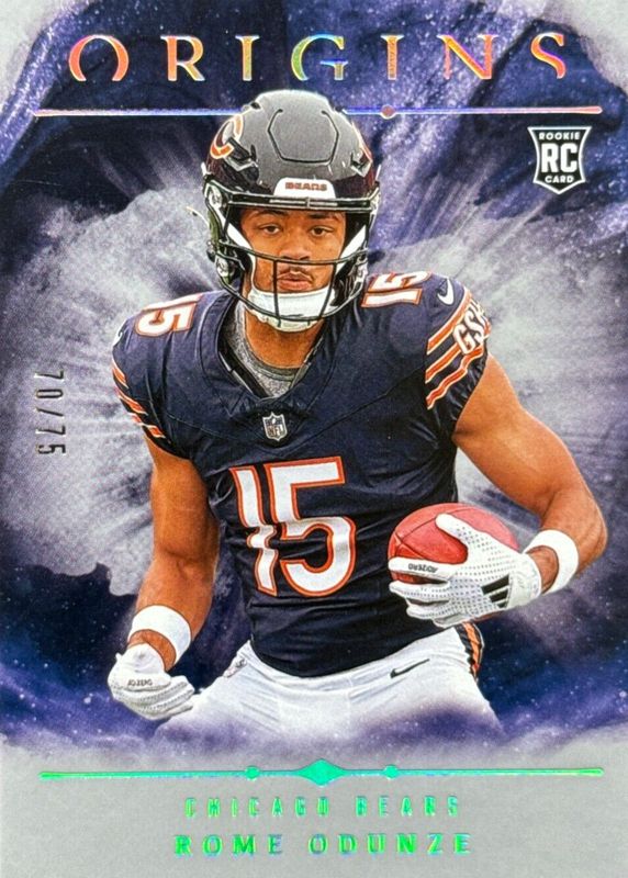 This card is 1 of 27 Rome Odunze's card variations in the 2024 Origins set being tracked by Sports Card Investor, including Base, Holo Red /299, Holo Orange /149, Red /149, and Orange /125.