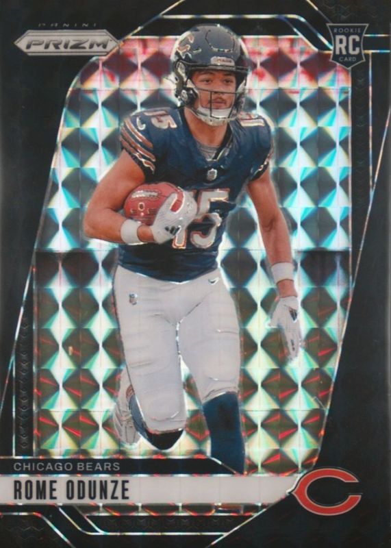 This card is 1 of 175 Rome Odunze's card variations in the 2024 Prizm set being tracked by Sports Card Investor, including Base, Choice Blue Yellow Green, Choice Silver, Disco, and Green.