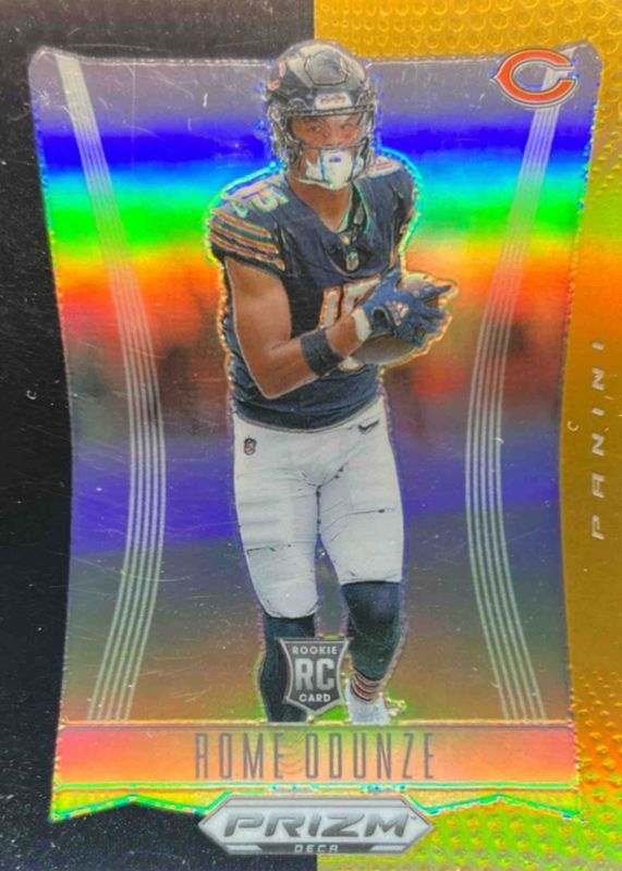 The Rome Odunze 2024 Prizm Deca #53 Black Gold /5 Rookie card in Raw condition has not changed in price in the last 30 days and was last sold for $275.00 .