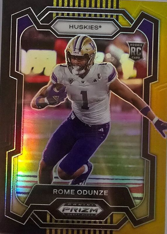 The Rome Odunze 2024 Prizm Draft Picks #111 Black & Gold /5 Rookie card in Raw condition has not changed in price in the last 30 days and was last sold for $77.77 .