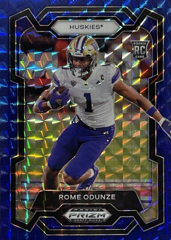 The Rome Odunze 2024 Prizm Draft Picks #111 Blue Finite /89 Rookie card in Raw condition has not changed in price in the last 30 days and was last sold for $7.99 .