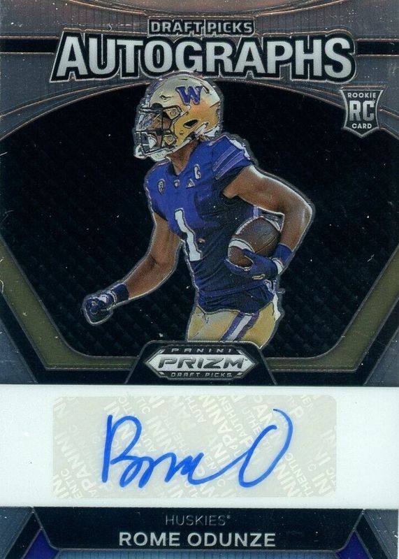The Rome Odunze 2024 Prizm Draft Picks #DPA-ROE Draft Picks Autographs Rookie card in Raw condition has not changed in price in the last 30 days and was last sold for $25.00 .