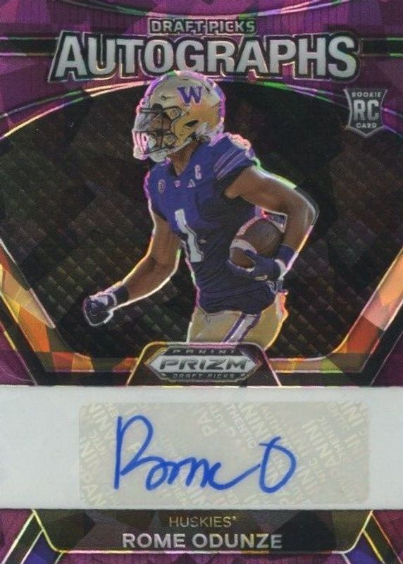 The Rome Odunze 2024 Prizm Draft Picks #DPA-ROE Draft Picks Autographs - Purple Ice /99 Rookie card in Raw condition has not changed in price in the last 30 days and was last sold for $29.01 .