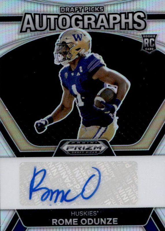 The Rome Odunze 2024 Prizm Draft Picks #DPA-ROE Draft Picks Autographs - Silver Rookie card in Raw condition has not changed in price in the last 30 days and was last sold for $25.00 .