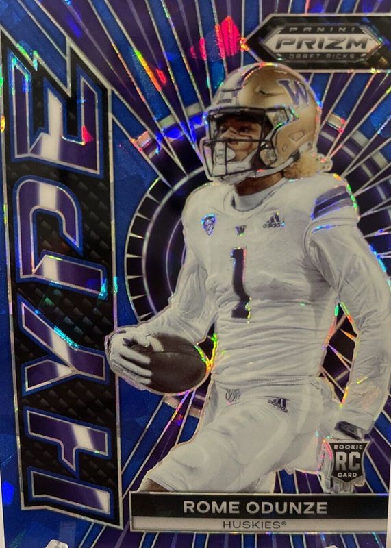 The Rome Odunze 2024 Prizm Draft Picks #HP-RO Hype - Blue Ice /99 Rookie card in Raw condition has not changed in price in the last 30 days and was last sold for $8.16 .