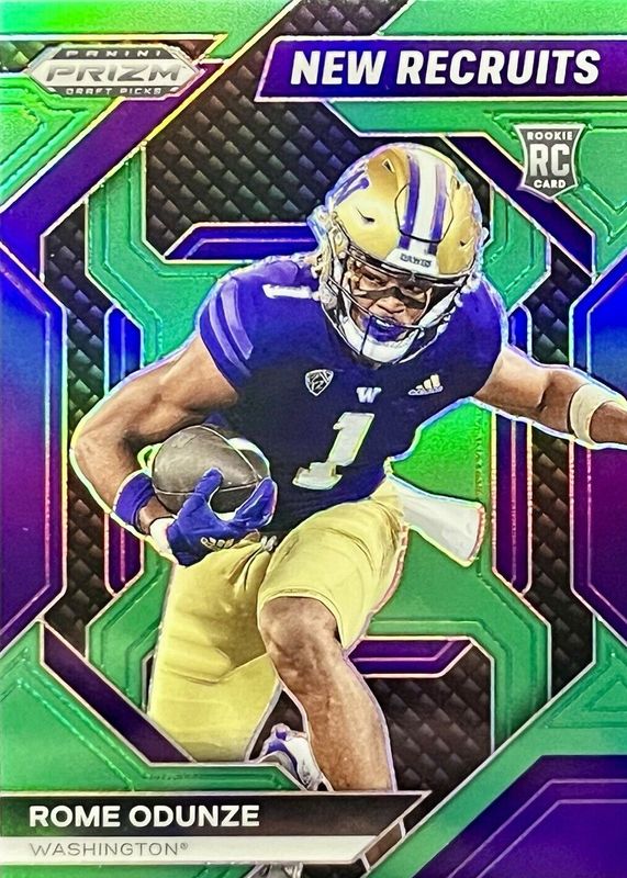 The Rome Odunze 2024 Prizm Draft Picks #NR-ROE New Recruits - Green Rookie card in Raw condition has not changed in price in the last 30 days and was last sold for $1.04 .