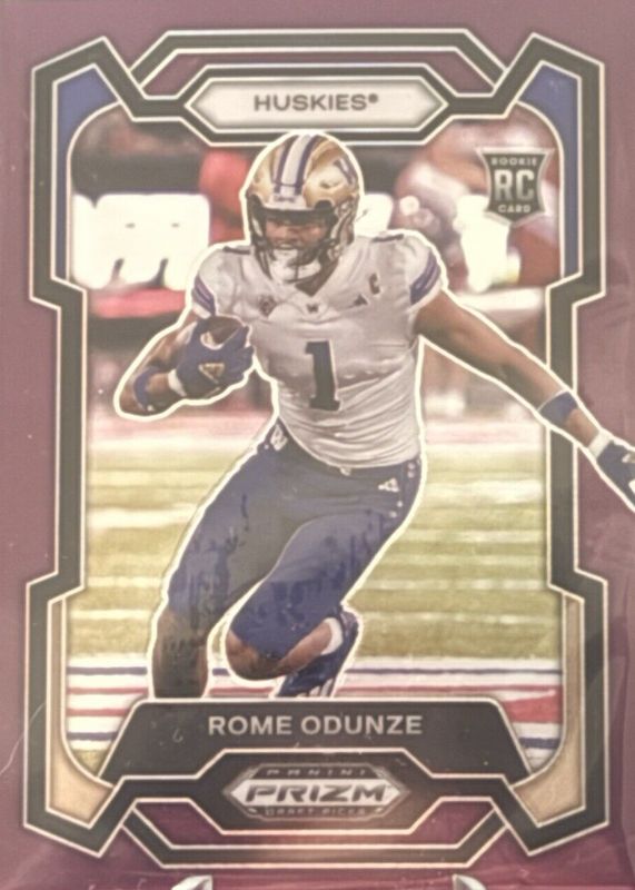 The Rome Odunze 2024 Prizm Draft Picks #111 Purple /75 Rookie card in Raw condition has not changed in price in the last 30 days and was last sold for $14.00 .