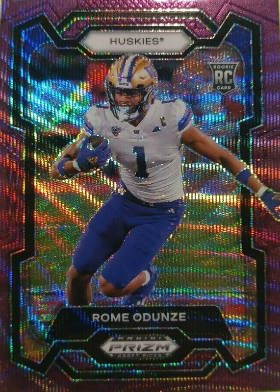 The Rome Odunze 2024 Prizm Draft Picks #111 Purple Wave Rookie card in Raw condition has moved down -$4.51 (-82.0%) in the last 30 days and was last sold for $0.99 .