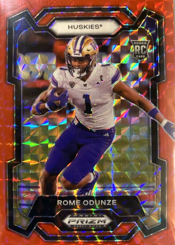 The Rome Odunze 2024 Prizm Draft Picks #111 Red Finite /125 Rookie card in Raw condition has not changed in price in the last 30 days and was last sold for $3.75 .