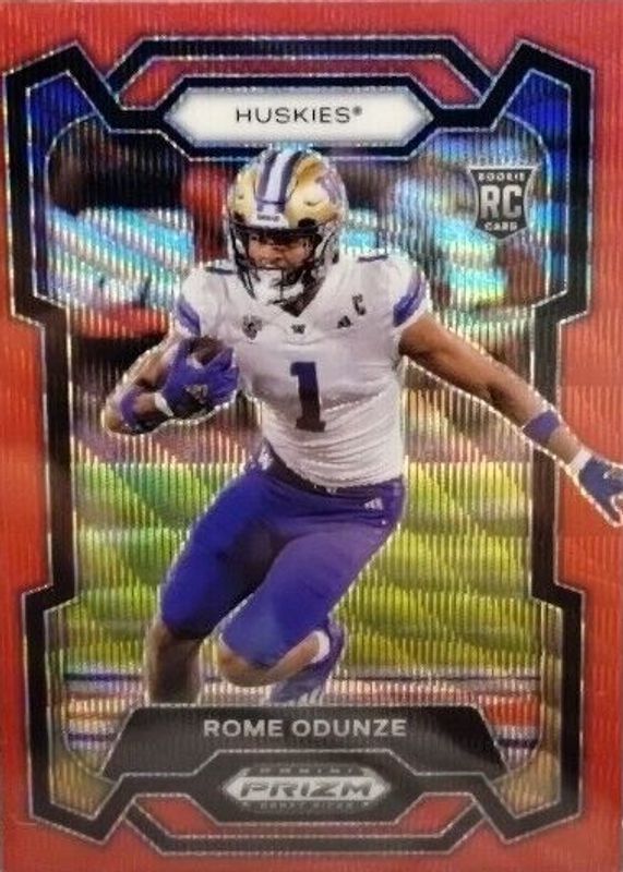 The Rome Odunze 2024 Prizm Draft Picks #111 Ruby Wave Rookie card in Raw condition has not changed in price in the last 30 days and was last sold for $1.25 .