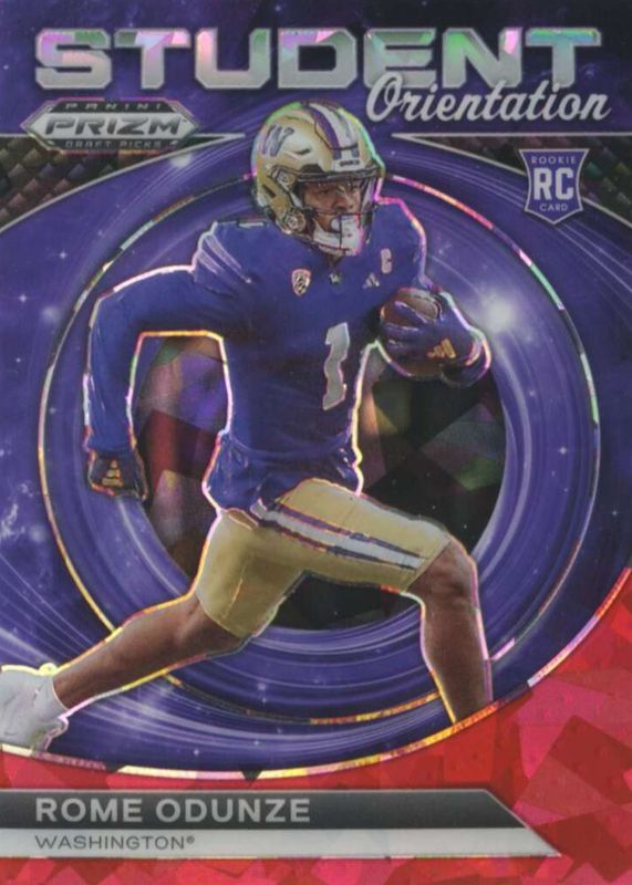 The Rome Odunze 2024 Prizm Draft Picks #SO-RO Student Orientation - Red Ice Rookie card in Raw condition has moved down -$0.74 (-37.2%) in the last 30 days and was last sold for $1.25 .