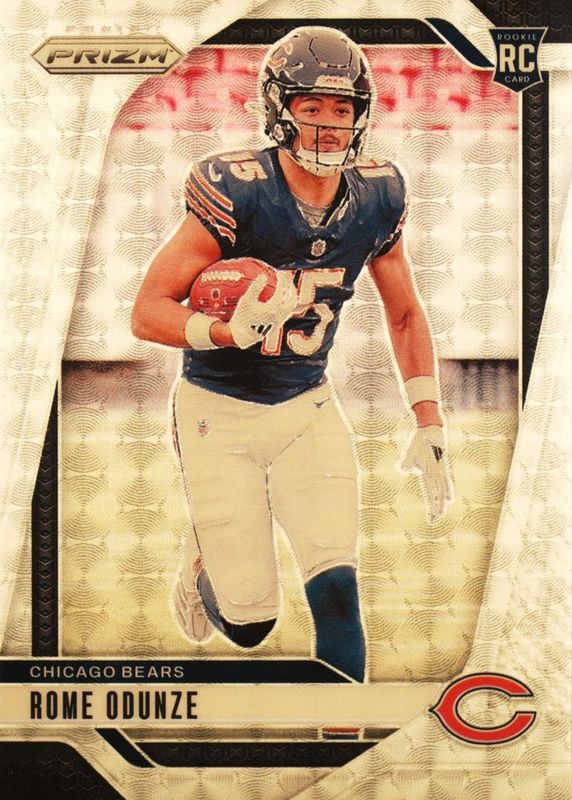 This card is 1 of 175 Rome Odunze's card variations in the 2024 Prizm set being tracked by Sports Card Investor, including Base, Choice Blue Yellow Green, Choice Silver, Disco, and Green.