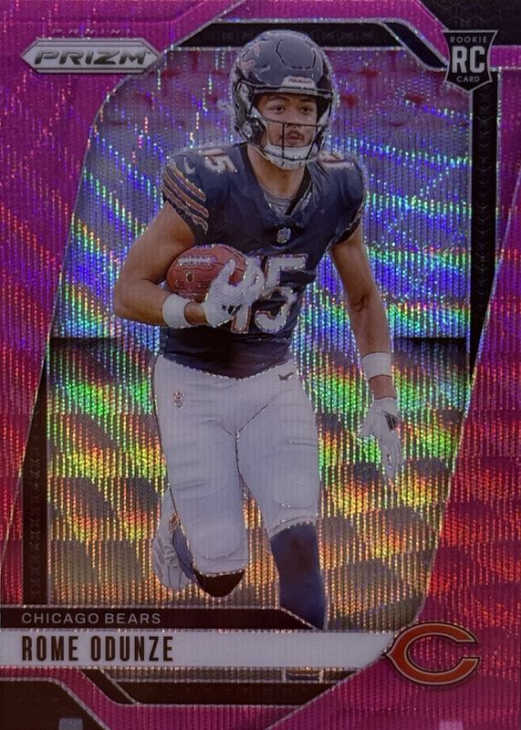 The Rome Odunze 2024 Prizm #385 Pink Wave Rookie card in Raw condition has moved down -$0.81 (-14.7%) in the last 30 days and was last sold for $4.69 .