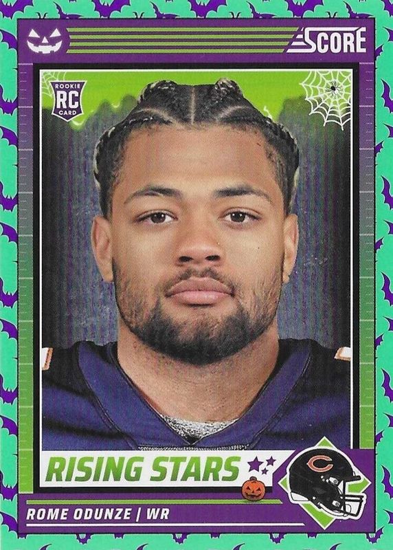 This card is 1 of 3 Rome Odunze's card variations in the 2024 Score-A-Treat set being tracked by Sports Card Investor, including Rising Stars - Orange Pumpkins, and Rising Stars - Trick or Treat /99.