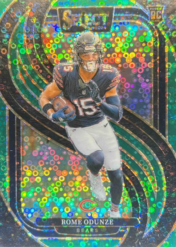 The Rome Odunze 2024 Select #136 Premier Level Green Disco /5 Rookie card in Raw condition has not changed in price in the last 30 days and was last sold for $122.50 .