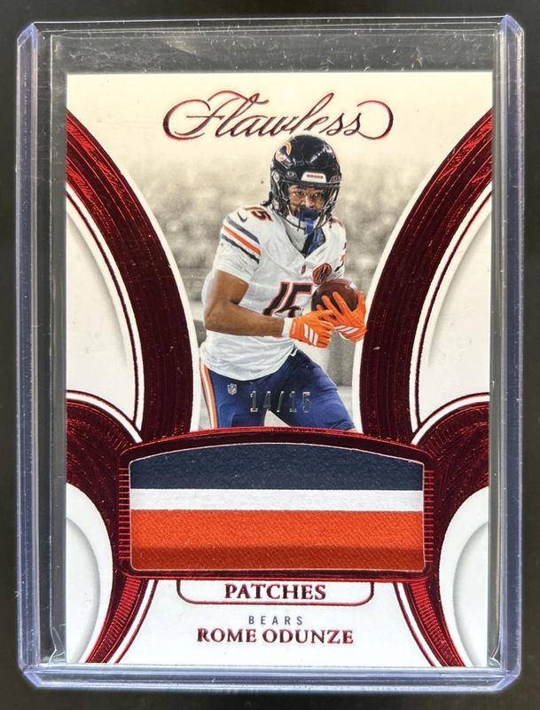 The Rome Odunze 2025 Flawless #4 Patches - Ruby /15 card is 1 of 28 Rome Odunze's card variations in the 2025 Flawless set being tracked by Sports Card Investor, including Ruby /25, Sapphire /20, Diamond /15, Emerald /5, and Aquamarine /3.
