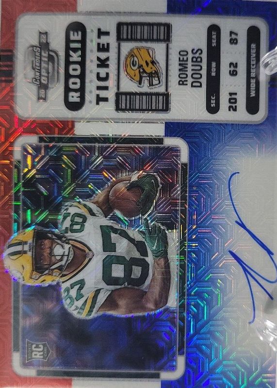 The Romeo Doubs 2022 Contenders Optic #132 Rookie Ticket Auto Variation - Red White Blue /13 card in Raw condition has not changed in price in the last 30 days and was last sold for $143.00 .