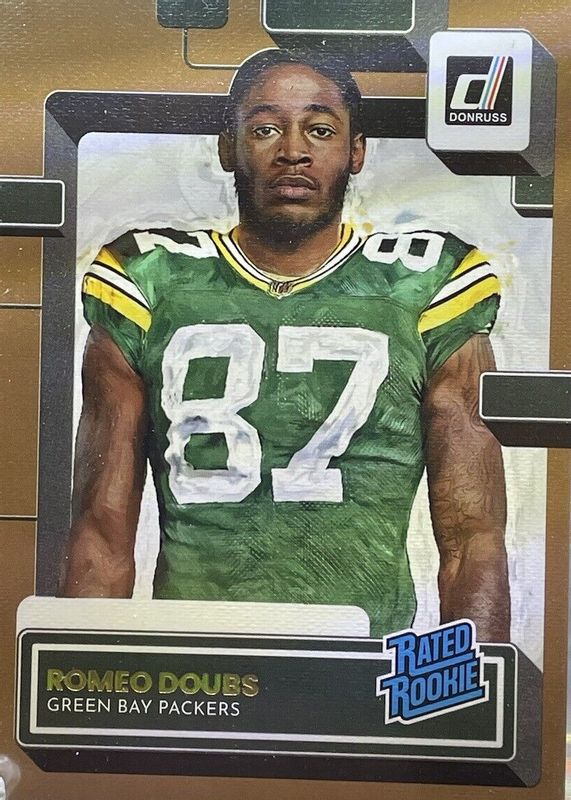 The Romeo Doubs 2022 Donruss #335 Portrait - Studio Series /100 Rookie card in Raw condition has not changed in price in the last 30 days and was last sold for $4.99 .