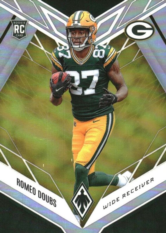 This card is 1 of 27 Romeo Doubs' card variations in the 2022 Phoenix set being tracked by Sports Card Investor, including Base, Color Burst, Onyx (/5), Red Mojo (/10), and Silver.