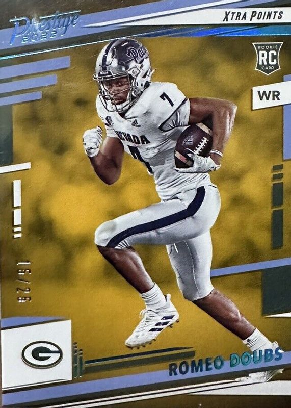 This card is 1 of 24 Romeo Doubs' card variations in the 2022 Prestige set being tracked by Sports Card Investor, including Base, Xtra Points Astral, Xtra Points Diamond, Xtra Points Dots, and Xtra Points Galaxy.