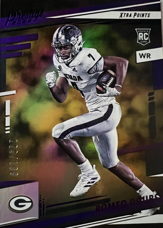 The Romeo Doubs 2022 Prestige #329 Xtra Points Purple /199 Rookie card in Raw condition has not changed in price in the last 30 days and was last sold for $1.04 .