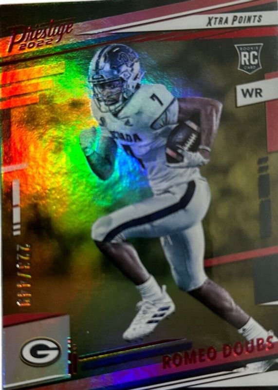 The Romeo Doubs 2022 Prestige #329 Xtra Points Red /449 Rookie card in Raw condition has not changed in price in the last 30 days and was last sold for $0.99 .