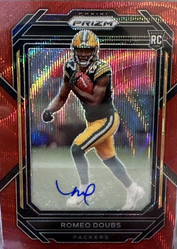 The Romeo Doubs 2022 Prizm #337 Rookie Autographs - Red Wave /149 card in Raw condition has not changed in price in the last 30 days and was last sold for $17.00 .