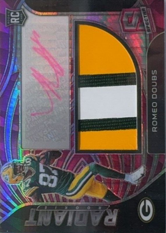 The Romeo Doubs 2022 Spectra #RAD-RDO Radiant Rookie Patch Signatures - Neon Pink /25 card in Raw condition has not changed in price in the last 30 days and was last sold for $65.00 .