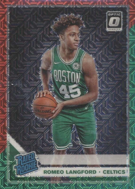 The Romeo Langford 2019 Optic #182 Choice Red & Green Rookie card in Raw condition has not changed in price in the last 30 days and was last sold for $2.99 .