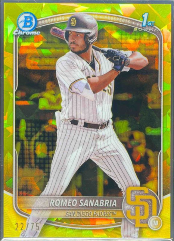 The Romeo Sanabria 2025 Bowman Sapphire Edition #BCP-3 Chrome Prospects - Yellow Refractor /75 card is 1 of 9 Romeo Sanabria's card variations in the 2025 Bowman Sapphire Edition set being tracked by Sports Card Investor, including Chrome Prospects, Chrome Prospects - Green Refractor /99, Chrome Prospects - Gold Refractor /50, Chrome Prospects - Orange Refractor /25, and Chrome Prospects - Black Refractor /10.