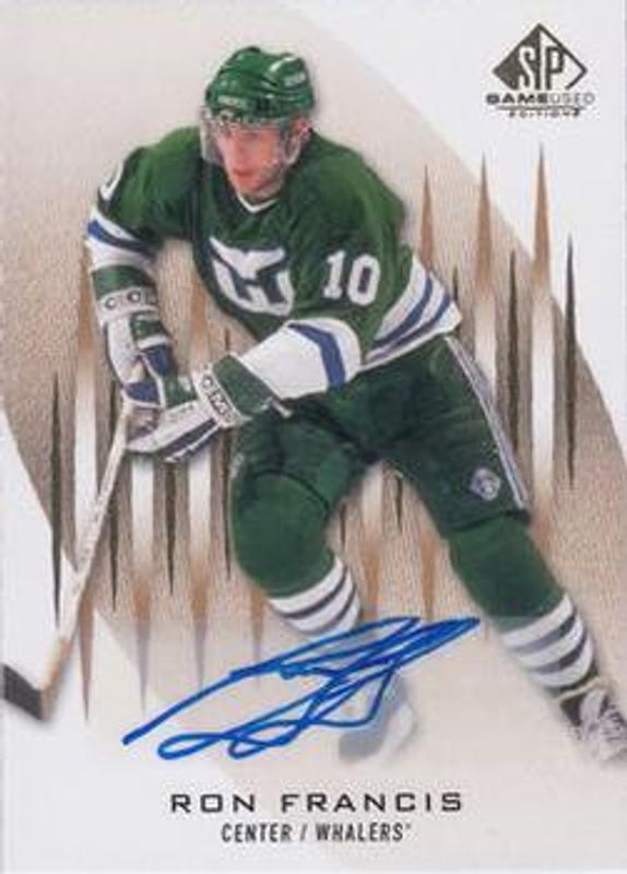 Ron Francis' Hockey cards are available in at least 189 sets. Ron Francis' biggest 7-day price movers are 2013 SP Game Used #62 Gold Autographs, 2013 SP Game Used #SS-RF Supreme Sticks /12, and 2013 SP Game Used #62 Base /27.