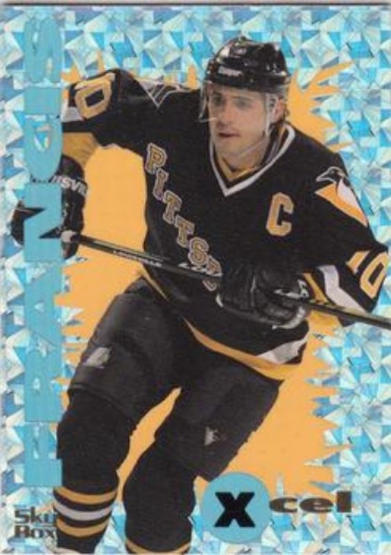 Other popular players in the 1995 Skybox E-Motion set include Alexei Yashin, Alexei Zhamnov, Eric Lindros, Jeremy Roenick, and Joe Sakic.