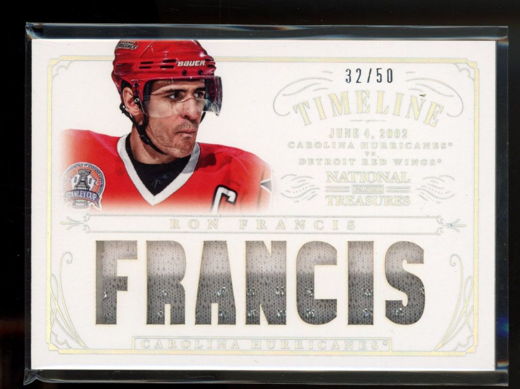 The Ron Francis 2013 National Treasures #T-RF Timeline Jerseys Prime /50 card is 1 of 37 Ron Francis' card variations in the 2013 National Treasures set being tracked by Sports Card Investor, including Base /99, Gold /25, Silver /25, Emerald /5, and Black /1.