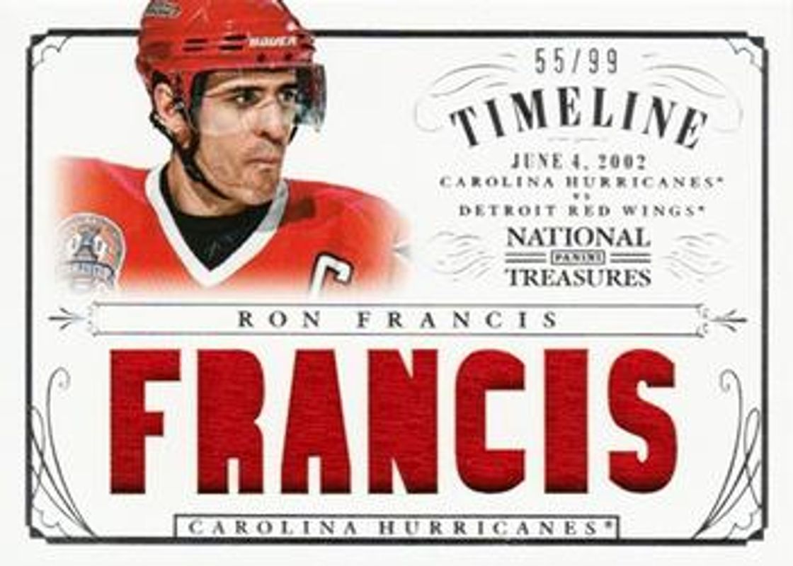 The Ron Francis 2013 National Treasures #T-RF Timeline Jerseys /99 card is 1 of 37 Ron Francis' card variations in the 2013 National Treasures set being tracked by Sports Card Investor, including Base /99, Gold /25, Silver /25, Emerald /5, and Black /1.