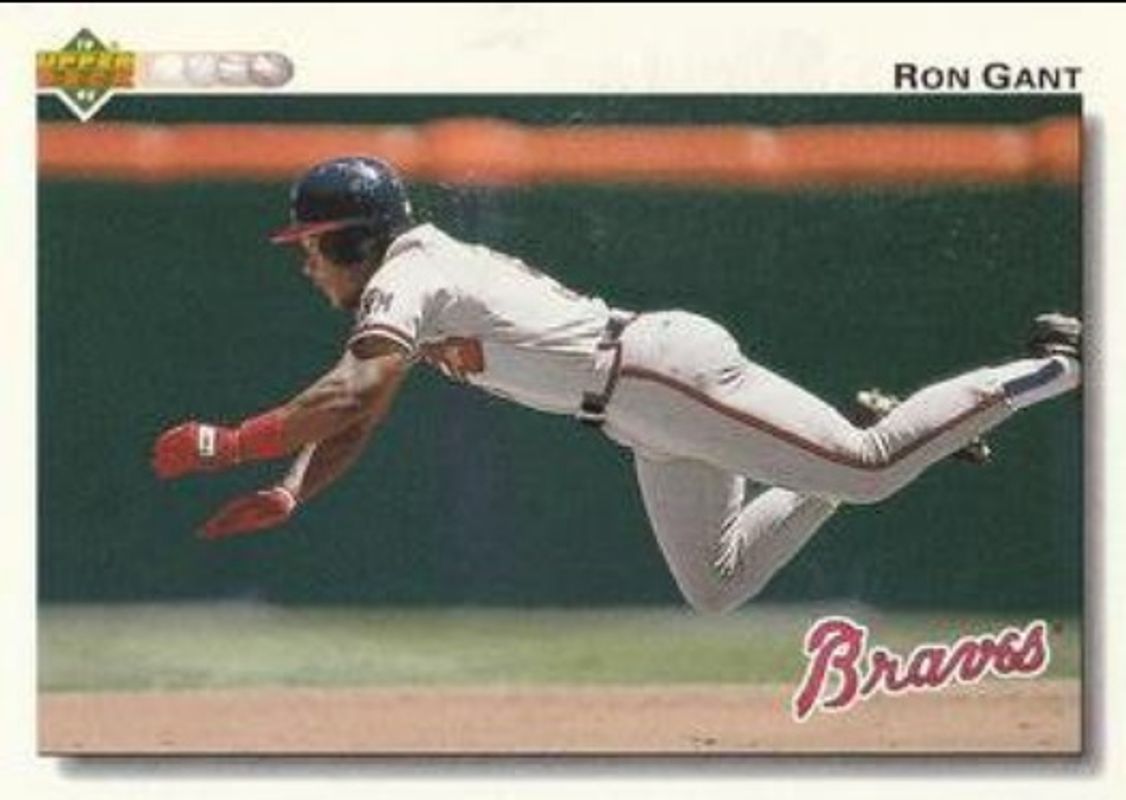 The Ron Gant 1992 Upper Deck #345 Base card is 1 of 3 Ron Gant's card variations in the 1992 Upper Deck set being tracked by Sports Card Investor, including Gold Hologram, and Homerun Heroes.