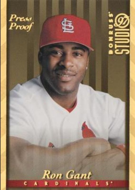 The Ron Gant 1997 Donruss Studio #4 Press Proof Gold card is 1 of 3 Ron Gant's card variations in the 1997 Donruss Studio set being tracked by Sports Card Investor, including Base, and Press Proof Silver.