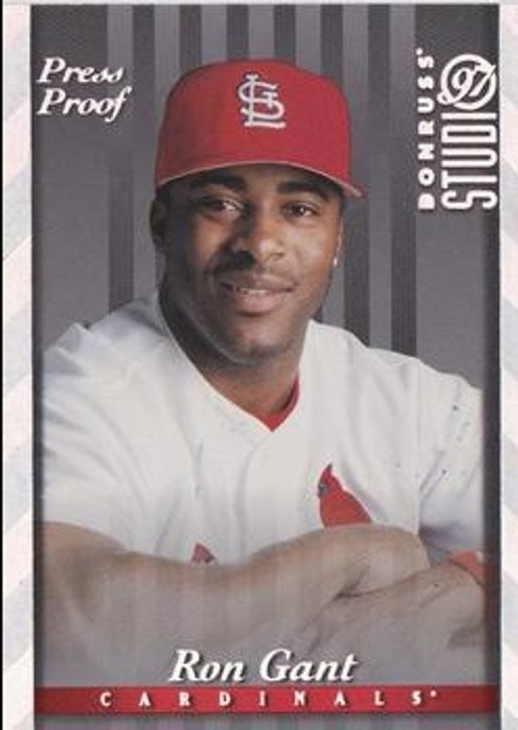 The Ron Gant 1997 Donruss Studio #4 Press Proof Silver card is 1 of 3 Ron Gant's card variations in the 1997 Donruss Studio set being tracked by Sports Card Investor, including Base, and Press Proof Gold.