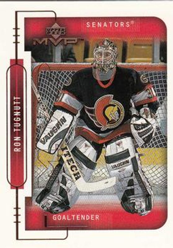 The Ron Tugnutt 1999 Upper Deck MVP #142 Base card is 1 of 5 Ron Tugnutt's card variations in the 1999 Upper Deck MVP set being tracked by Sports Card Investor, including Silver Script, Gold Script /100, Super Script /25, and ProSign.