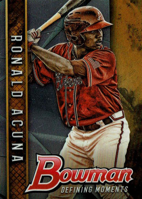The Ronald Acuna Jr. 2017 Bowman Draft #BDM-RA Bowman Defining Moments card in Raw condition has moved up $0.81 (+81.8%) in the last 30 days and was last sold for $1.80 .