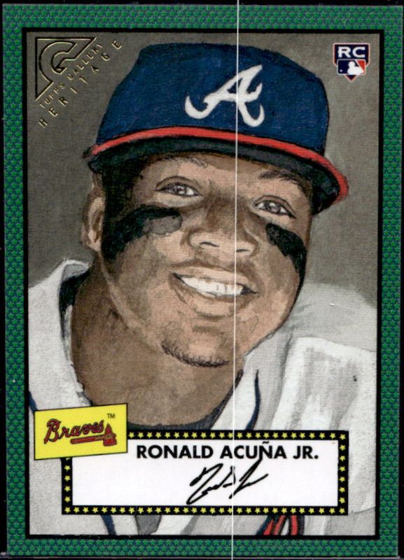 The Ronald Acuna Jr. 2018 Topps Gallery #H-40 Heritage - Green /250 Rookie card is 1 of 33 Ronald Acuna Jr.'s card variations in the 2018 Topps Gallery set being tracked by Sports Card Investor, including Base, Artist Proof, Wood, Private Issue /250, and Green /99.