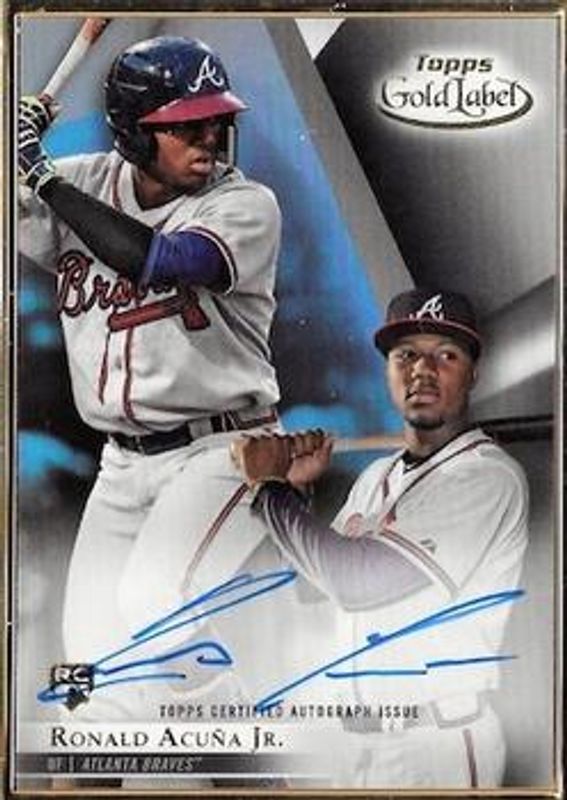 The Ronald Acuna Jr. 2018 Topps Gold Label #FA-RA Framed Autographs /75 Rookie card is 1 of 26 Ronald Acuna Jr.'s card variations in the 2018 Topps Gold Label set being tracked by Sports Card Investor, including Class 1, Class 2, Class 3, Class 1 - Black, and Class 2 - Black.