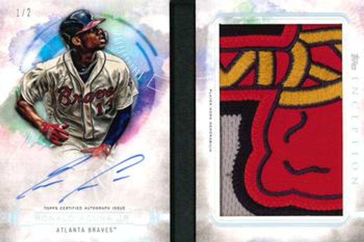 The Ronald Acuna Jr. 2019 Topps Inception #IATL-RAJ Autographed Team Logo Patch Book /2 card is 1 of 36 Ronald Acuna Jr.'s card variations in the 2019 Topps Inception set being tracked by Sports Card Investor, including Base, Green, Purple /150, Magenta /99, and Red /75.