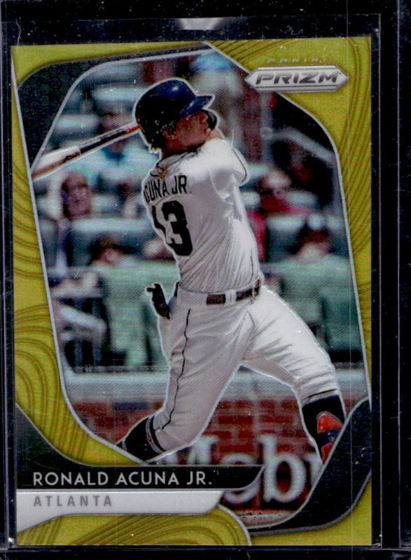 The Ronald Acuna Jr. 2020 Prizm #184 Gold /10 card is 1 of 123 Ronald Acuna Jr.'s card variations in the 2020 Prizm set being tracked by Sports Card Investor, including Base, Blue, Carolina Blue, Cosmic Haze, and Green.