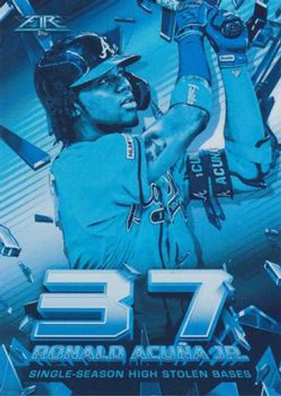 The Ronald Acuna Jr. 2020 Topps Fire #SS-2 Shattering Stats - Blue Chip card is 1 of 29 Ronald Acuna Jr.'s card variations in the 2020 Topps Fire set being tracked by Sports Card Investor, including Base, Blue Chip, Flame, Gold Minted, and Onyx.