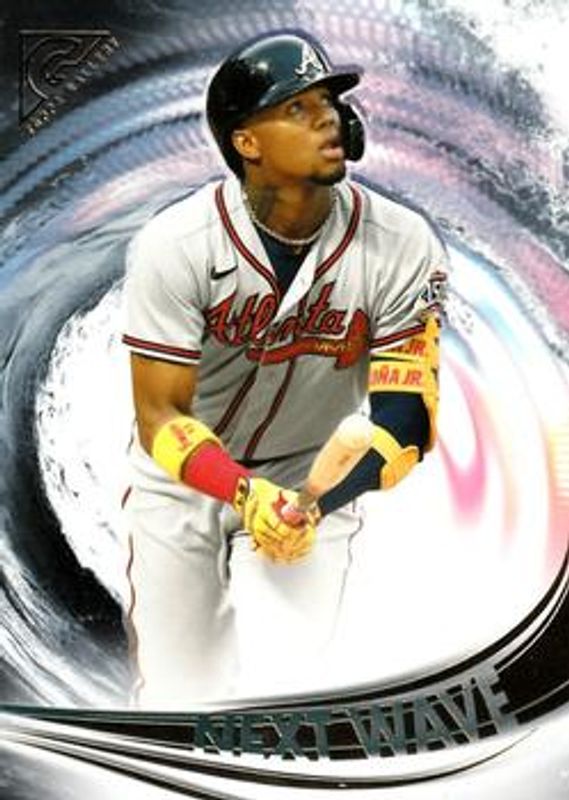 The Ronald Acuna Jr. 2021 Topps Gallery #NW-18 Next Wave card is 1 of 39 Ronald Acuna Jr.'s card variations in the 2021 Topps Gallery set being tracked by Sports Card Investor, including #56 Base, #56b Base, #56 Rainbow Foil, #56 Private Issue /250, and #56 Green /125.
