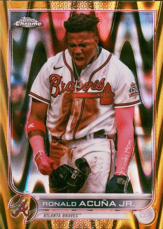 The Ronald Acuna Jr. 2022 Topps Chrome Sonic #165 Gold RayWave Refractor /50 card in Raw condition has not changed in price in the last 30 days and was last sold for $100.00 .